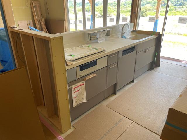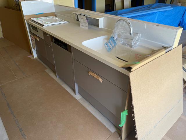 ・28日キッチン据付完了しました。養生してあります。 確認の際は取り外してください。 ・内部木工事、ドア・開口枠取り合い壁を納め幅木取付、 階段造作へと入っていきます。 ・外部給排水埋設へと入ります。 ・給水・給湯、雨水排水管、エコキュート専用配管を行います。