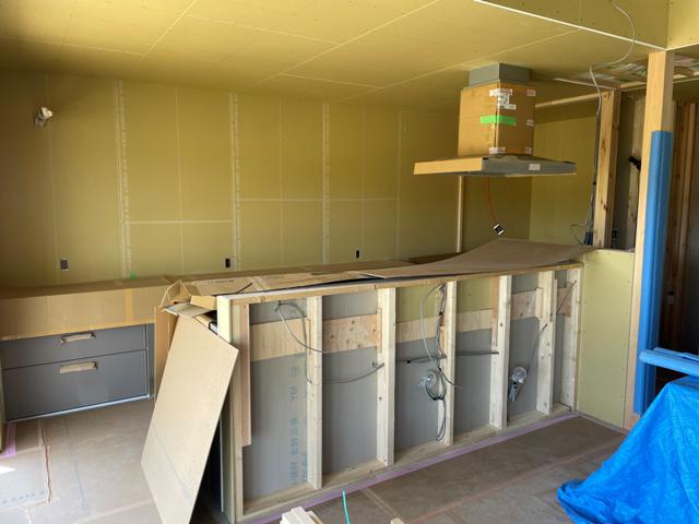 ★先週の工事★ 木工事(壁プラスターボード・壁下地合板貼り、階段造作) キッチン据付 ★今週の予定工事★ 木工事(壁プラスターボード・壁下地合板貼り、階段造作、 幅木取付、固定棚取付、他) 外部給排水埋設