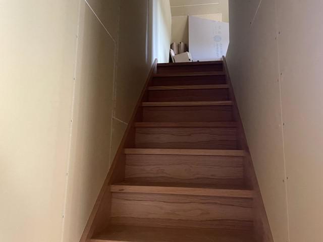 階段造作納め取り合い壁・天井ボード貼り、幅木・固定棚