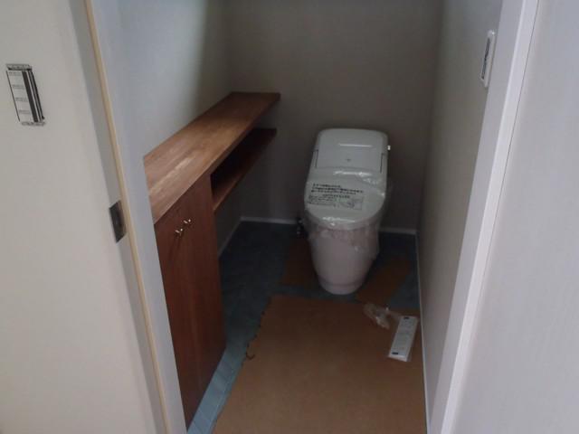 可動棚等取付、トイレ製作家具据付と進み、床養生引き上げ