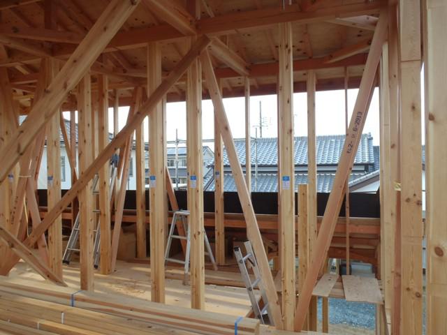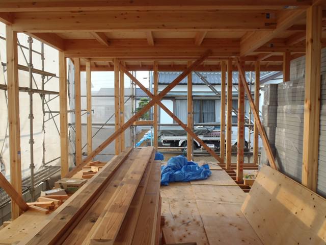 ・木工事、下屋根下地納め、2階筋違い・間柱入れと耐力壁と