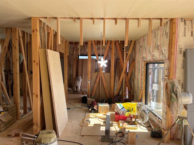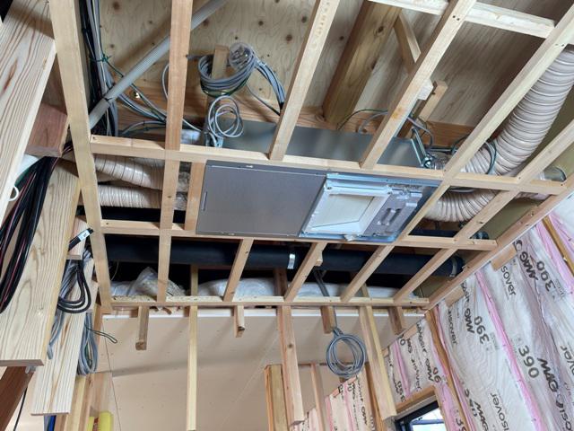 ・内部木工事1階天井下地組み断熱材入れ、天井ボード貼り、