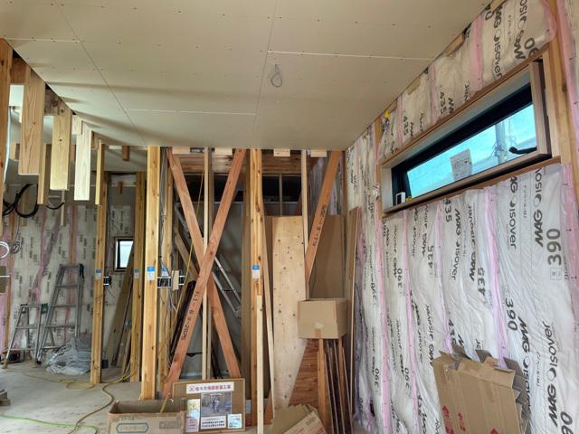 木工事(1階天井下地組及び天井ボード貼り、床クッション