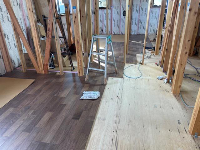 床フローリング貼り及び床養生敷き込みへと進めています。