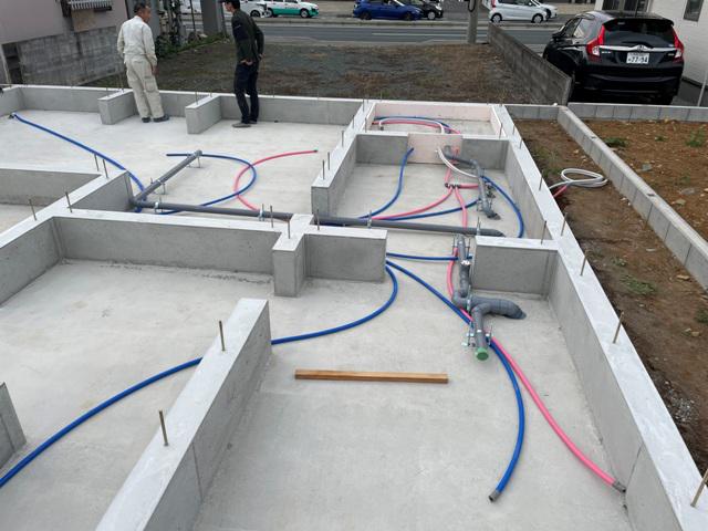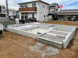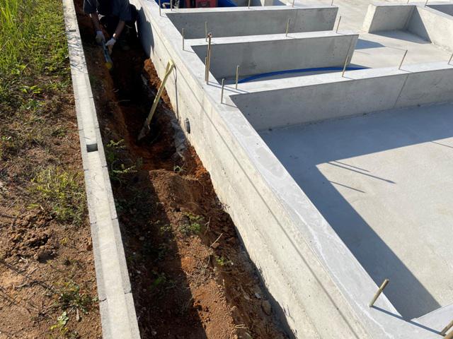 ・基礎工事、立ち上がり部の型枠解体、基礎廻り埋め戻し整地 玄関・ポーチタイルコンクリートを打ち終え基礎工事完了と なりました。 ・外部排水・雨水排水先行埋設、土台・床下地材搬入し上棟 準備・土台据え、床下地組みへと進めていきます。