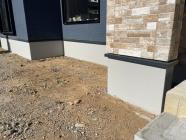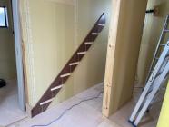 ・外部足場が解体され、建物全景を確認できるようになりま した。 基礎巾木塗り完了しました。 ・玄関・ポーチタイル工事、浄化槽据付予定しています。 ・内部木工事、階段吹き抜け前壁下地、階段造作へと進めて います。