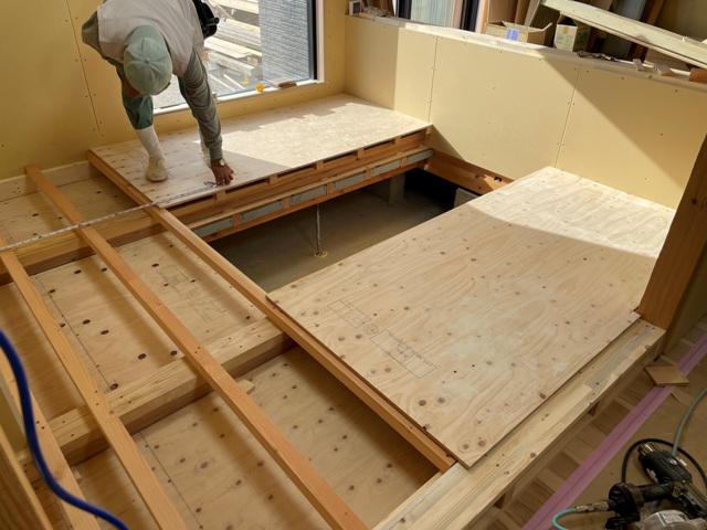 ・内部木工事、開口枠設置、取り合い部材納め、和室造作へ 取り掛かりました。和室床上げ下地組み、堀こたつ設置、 畳寄せ、白木建具枠加工設置へと進めていきます。