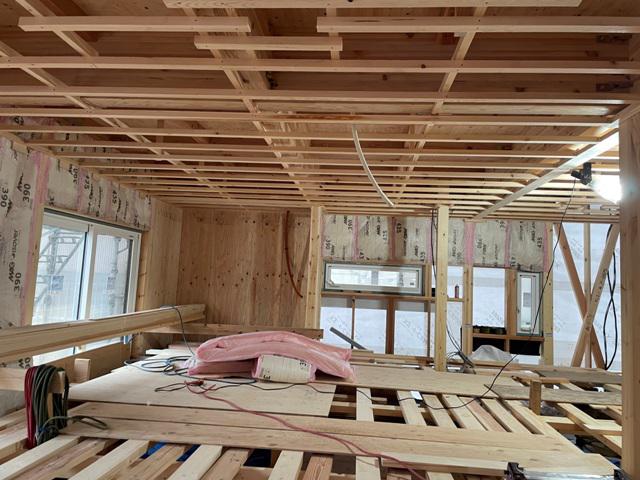 ★先週の工事★ 木工事(天井下地組み及び天井断熱材入れ、壁断熱材入れ 天井ボード貼り、他) 内部給排水配管・電気配線・配管 ★今週の予定工事★ 冬季休暇1/7まで