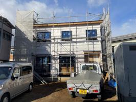 ・内部電気配線、配管・水道給排水管設置しました。換気扇 ダクト・排水管の外壁シート貫通部の防水処理材設置し年明け 保証機構による外装下地検査を受けます。 ・木工事、配線、配管終えた天井部のボード貼りを2階より 進めています。 ・外壁下地木材の設置にも取り掛かります。 ・当社冬季休暇を12/28から1/7まで頂きます。