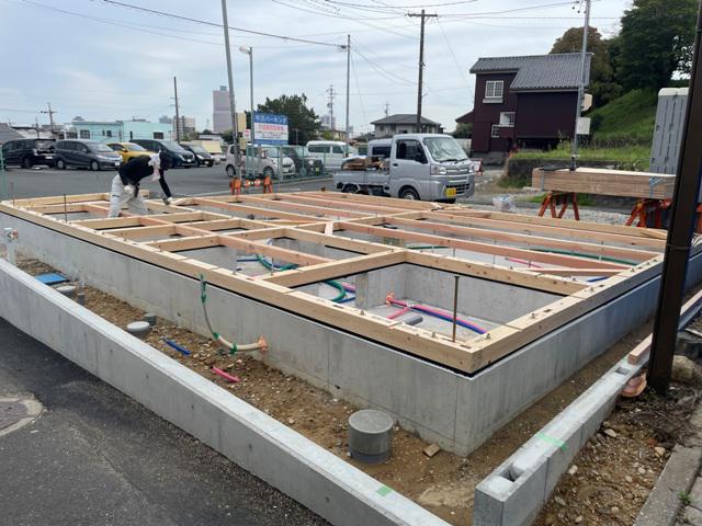 ★土台・1階床下地木材搬入、土台据え、床下地組み、 上棟準備 先行足場組み ★今週の予定工事★ 上棟 屋根防水シート葺き 木工事(筋カイ・間柱入れ、構造金物取付、他)