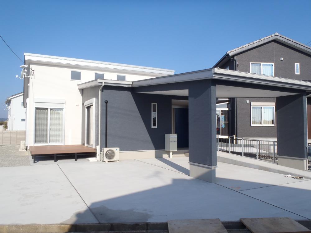 2019.12.23完成(ZEH) 全体的にブルーの色を使いまとまり のある内装に仕上がりました。 駐車場スペースにも屋根があるので 雨の日でも濡れずに済みます♪