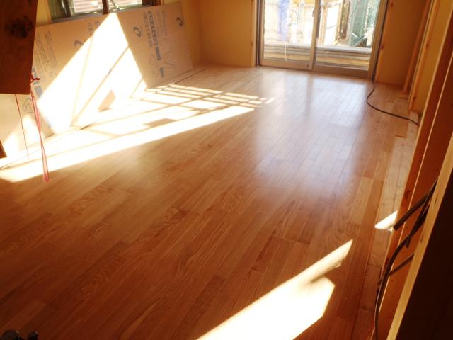 内部木工事・床フローリング張りを進め、 養生敷き・ドア/開口枠取付を取付ながら 壁ボード張りを進めていきます