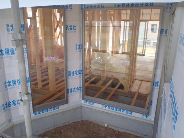 先週の工事 サッシ・ガラスが取付けられました! 30日には検査機構のJIOの中間検査があり、合格いたし ました。 外部には防湿シートが張られました。