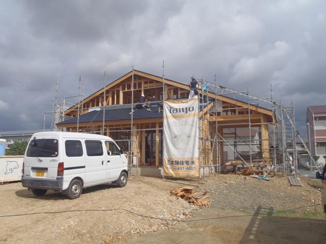 ☆先週の工事☆ 木工事(間柱入れ、構造金物取付、1階床下地、サッシ 取付、他) 屋根カラーベスト葺き 防腐防虫処理 ☆今週予定の工事☆ 木工事(1階床下断熱材入れ、下地合板、天井下地組み、 外壁下地打ち、他) 検査機構中間検査 JIO構造検査 外壁下地シート貼り
