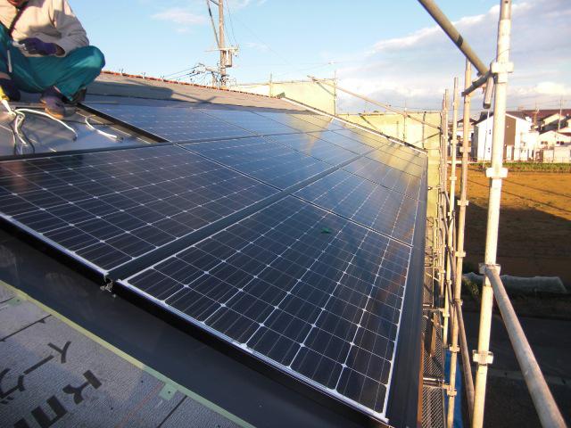 太陽光発電パネルの取付が完了しました!今週は残りの瓦を葺いて行きます。内部筋交い等も取付られています。
