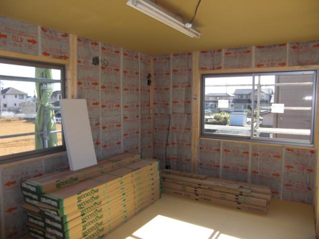 ☆先週の工事☆ 木工事(軒天下地組み及びケイカル板貼り、外部胴縁打ち、床ボ ード貼り、他) ユニットバス据付 ☆今週の予定工事☆ 木工事(フローリング貼り、窓枠取付、開口枠取付、他) 外壁工事(サイディング貼り)