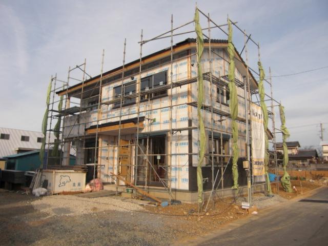 先週から外壁工事に入りました!下はチャコールグレーで落ち着いた感じです。出来上がりが楽しみです。内部は大工さんがフローリングを丁寧に施工しております。
