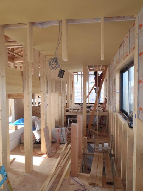 断熱材が敷き詰められ、天井ボードを貼り進めています。今週窓枠・床フローリングが搬入されますので床貼り、壁ボード貼りに取りかかります!