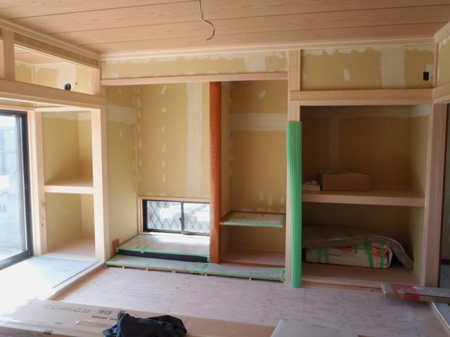 ☆先週の工事☆ 木工事(和室造作、幅木、廻し縁取付、建具吊り込み、他) 内装仕上げ工事(クロスパテ、クロス貼り) 外部給排水埋設 玄関ポーチタイル塗り ☆今週の予定工事☆ 内装仕上げ工事(クロス貼り、クッションシート貼り) 電気器具・プレート類取付 外部給排水埋設