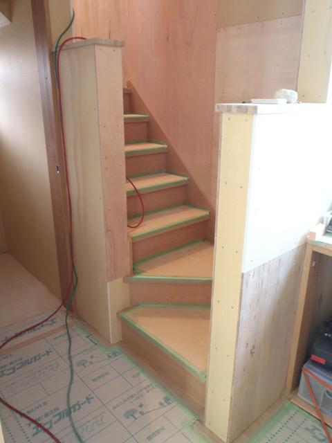 大工工事、室内階段ができました!残すは和室の造作と幅木・廻し縁となってきました。今週は外部の破風鼻隠板金と樋の取付を予定しております!