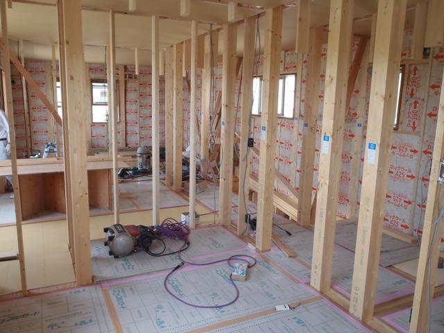 ☆先週の工事☆ 木工事(軒天ケイカル板、壁断熱材入れ、天井下地組み、 天井ボード貼り、2階床下地ボード、他) 外壁工事(サイディング下地、サイディング貼り) ☆今週の予定工事☆ 木工事(2階床下地ボード・フローリング貼り、1階天井下地 組み、他) 外壁工事(サイディング下地、サイディング貼り)