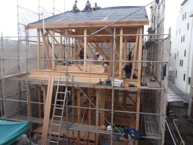 ☆先週の工事☆ 上棟 木工事(筋カイ・間柱入れ、構造金物取付、他) 屋根工事(瓦下地、荷揚げ、瓦葺き) ☆今週の予定工事☆ 木工事(床下地、サッシ開口、他) 屋根工事(瓦葺き)