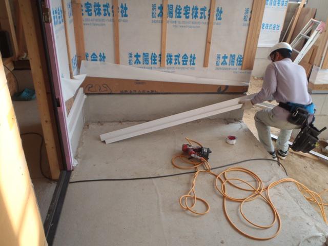 ☆先週の工事☆ 木工事(軒下、化粧材貼り、壁ボード貼り、床無垢フローリング貼り 開口造作、他) 土台水切り取付、外壁下地 ☆今週の予定工事☆ 木工事(床無垢フローリング貼り、床養生、開口造作、他) 外壁工事(コーナー材取付、平部サイディング貼り)