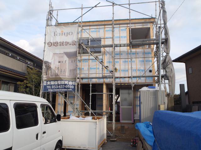 先週より外壁工事へと入っております!木工事では玄関ポーチの天井にパイン材が張られましてとてもいい感じに仕上がっています。 今週は天気が心配ですが、外壁工事・内部大工工事を引き続き行って行きます。
