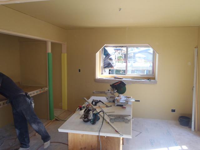 先週、外壁工事、外部周りが殆ど終わりまして、内部大工工事は和室の造作や幅木、廻し縁工事に取り掛かっております。