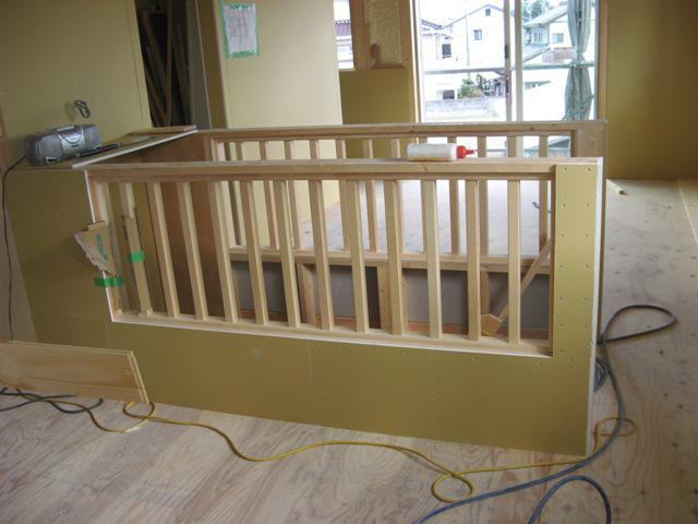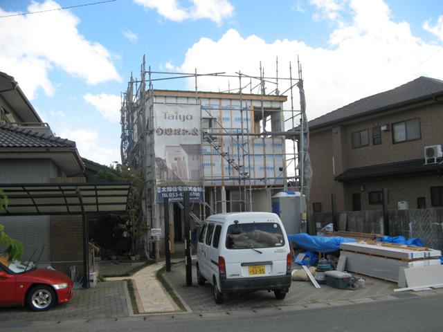 先週より大工工事により床張りが行われています!階段手摺りが付き段々と形になってきました!今週には外壁工事がほぼ完成になる予定です。