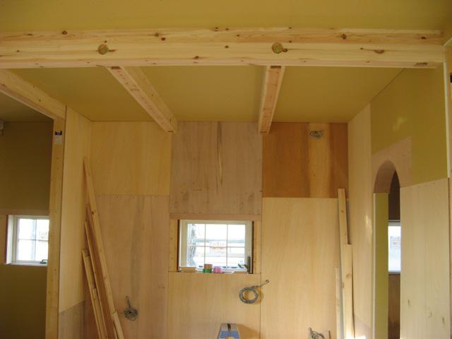 外壁工事、サイディングを張り終えコーキング打ちへと入って行きます。内部、大工工事では床にムクのフローリング材が施工されてきています。ムクは傷つきやすいので養生シートでしっかり保護していきます。