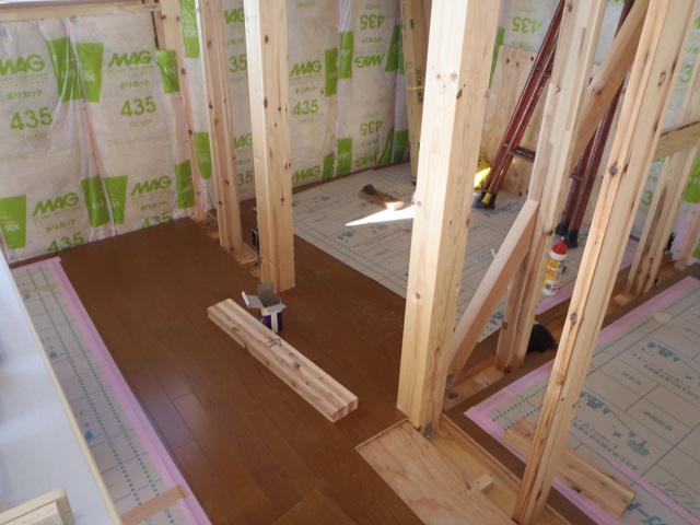 ・木工事、階段造作が完了し、2階壁ボード、下地合板貼りが 進められ、各部屋が間切られてきました。 ・外壁工事、平板サイディング貼りを進め、コーキング打ちへと 入っていきます。コーキング材が乾き次第、軒天塗装に入り ます。