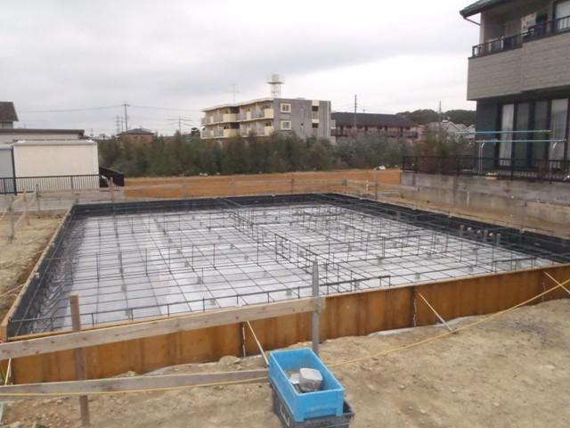 基礎工事が進んでいます。鉄筋組みを行いまして保証機構JIOの配筋検査(コンクリートの骨組みとなる鉄筋組み状況、コンクリートと鉄筋との幅等)検査合格しベースコン打ちをしました。