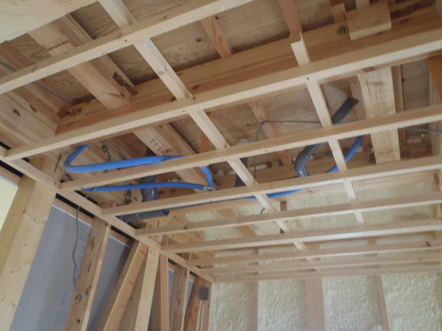・外壁コーキング工事が完了し、軒天(軒下)塗装に入ります。 ・内部木工事、LDK・玄関フローリング・框取付をし、天井ボード 貼り、1階ドア開口枠取付けながら、壁ボード・下地合板貼り を進めています。