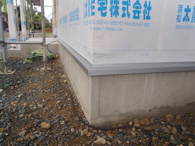 木工事、吹き付け断熱下地材を屋根下へ隙間なく埋め、 下準備を進めています。 土台水切り板金材が取付られ、外壁下地材取付を行っていき ます