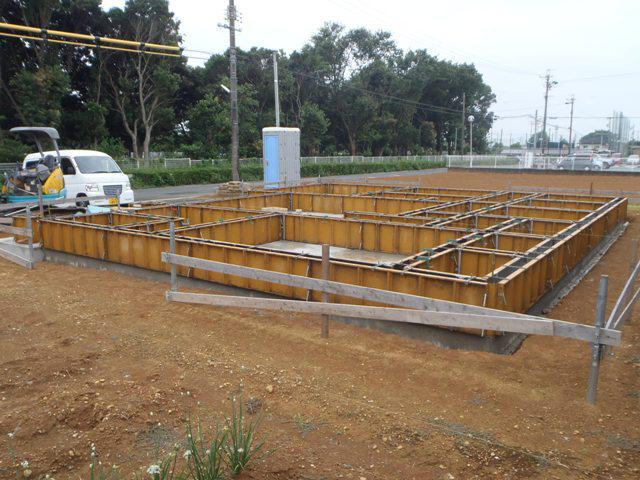 ・基礎工事、立ち上り部型枠組み、アンカーボルト類設置、コンクリートを 打ち終え、養生中です。 ・来週、型枠を解体し、基礎周り埋め戻し整地、玄関・ポーチタイル 下地コンクリート打ちをし、基礎工事完了となります。