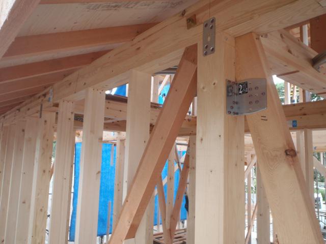 ・木工事、耐力壁となる筋違・間柱を入れながら、構造金物取付