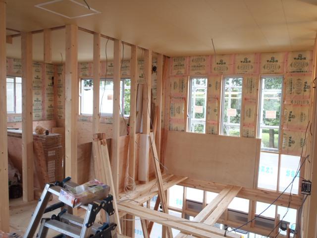 ☆先週の工事☆ 木工事(天井下地組み、壁断熱材入れ、他) 太陽光パネル設置 ☆今週の予定工事☆ 木工事(2階床フローリング貼り及び壁ボード貼り、天井下地組み、 他) 外壁工事(外壁下地、サイディング貼り、他) ユニットバス据付け