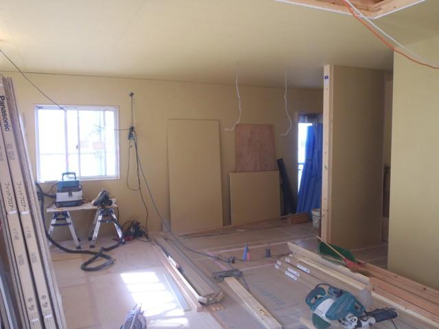 ・木工事、1階窓枠・ドア開口枠を取付ながら、壁ボード貼りを