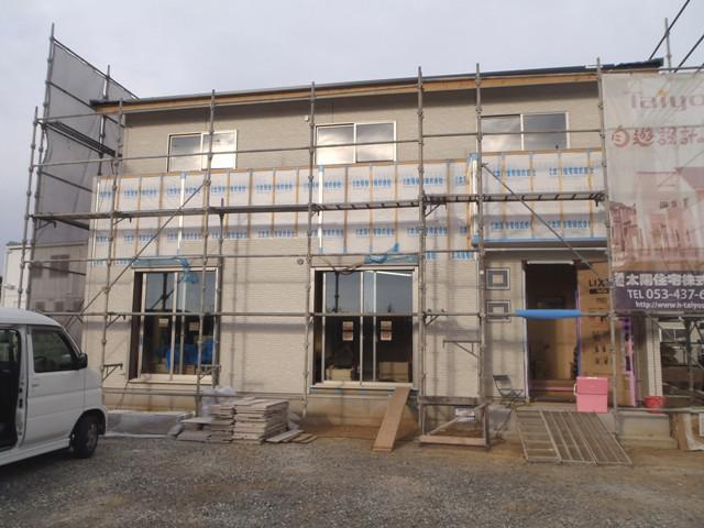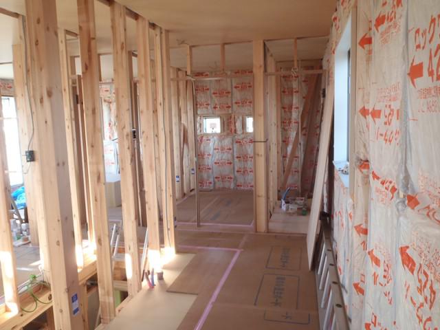 ・外激サイディング貼りが完了し、コーキング打ちを進めています。 コーキング材乾き次第軒天塗装に入ります。 ・内部木工事、1階床フローリング貼り、窓枠取付、壁ボード 下地合板貼り絵を進めています。