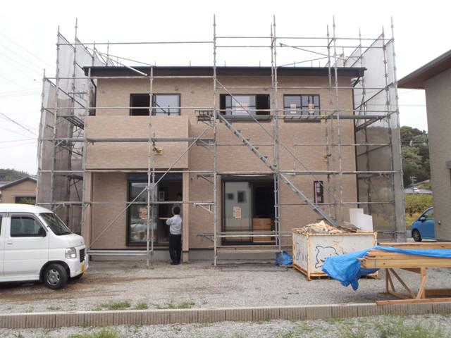 ・外部工事、軒天塗装、板金・トイ掛けが完了しました。 外部換気扇フード類、TVアンテナ取付を進めています。 ・内部木工事、ドア開口枠を取付2階より、幅木・廻し縁及び 棚類取付、階段造作を進めています。 10日、キッチン据付が完了しました。