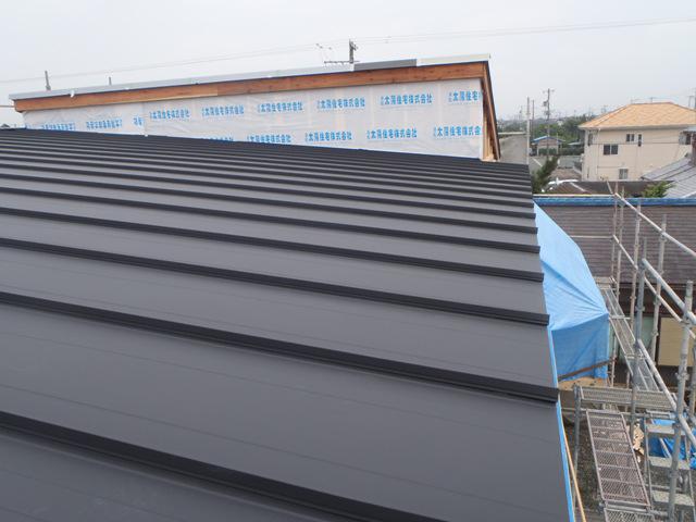 ・上棟おめでとうございます。天候に恵まれ予定工事が無事 完了し、上棟式・餅投げには多くの方にお集まり頂きま した。 ・屋根ガルバニウム鋼板を葺き上げ、役物板金(棟包み・壁際 板金)行っていきます。 ・木工事、筋カイ・間柱入れ、構造金物取付、1・2階床下地と 進めています。