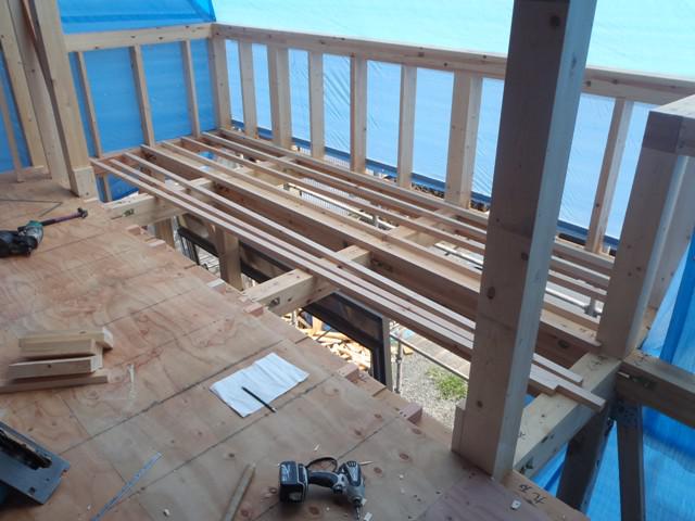 ・7月に入ってから雨が続き、構造・下地材を濡らさぬ様に ブルーシートをかけ、木工事・構造金物取付、2階床下地及び 下地合板本締め、ベランダ下地と行っています。 ・一部窓サッシが搬入され、サッシ開口等にも取り掛かって います。