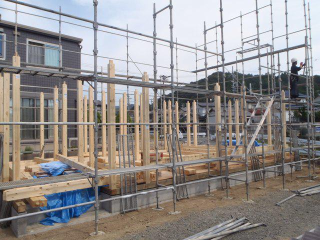 ・基礎工事が完了し、上棟準備へと入り土台据え、床下地組み、 2階貼り、柱、下地木材搬入し、外部足場組みを行い、いよ いよ上棟を迎えます。 ・上棟当日は、構造材を組み屋根下地まで進める予定です。