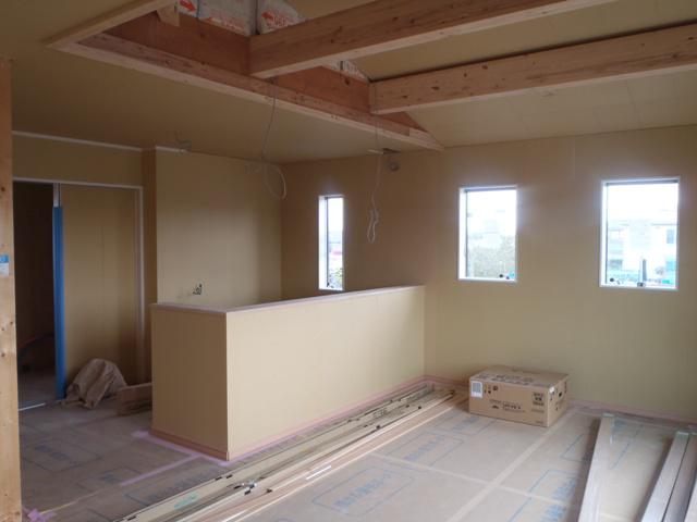 ・19日に1階システムキッチン据付完了、2階28日・29日据付予定 です。内部木工事、和室造作を完了し、カウンター材・笠木取付、 SIC棚類造作を進めています。2階勾配天井材が搬入され、 天井貼り、建具吊込みを予定しています。