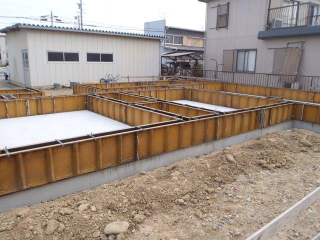 検査)を受け、ベースコンクリート打ち、立ち上がり型枠組み、アンカー