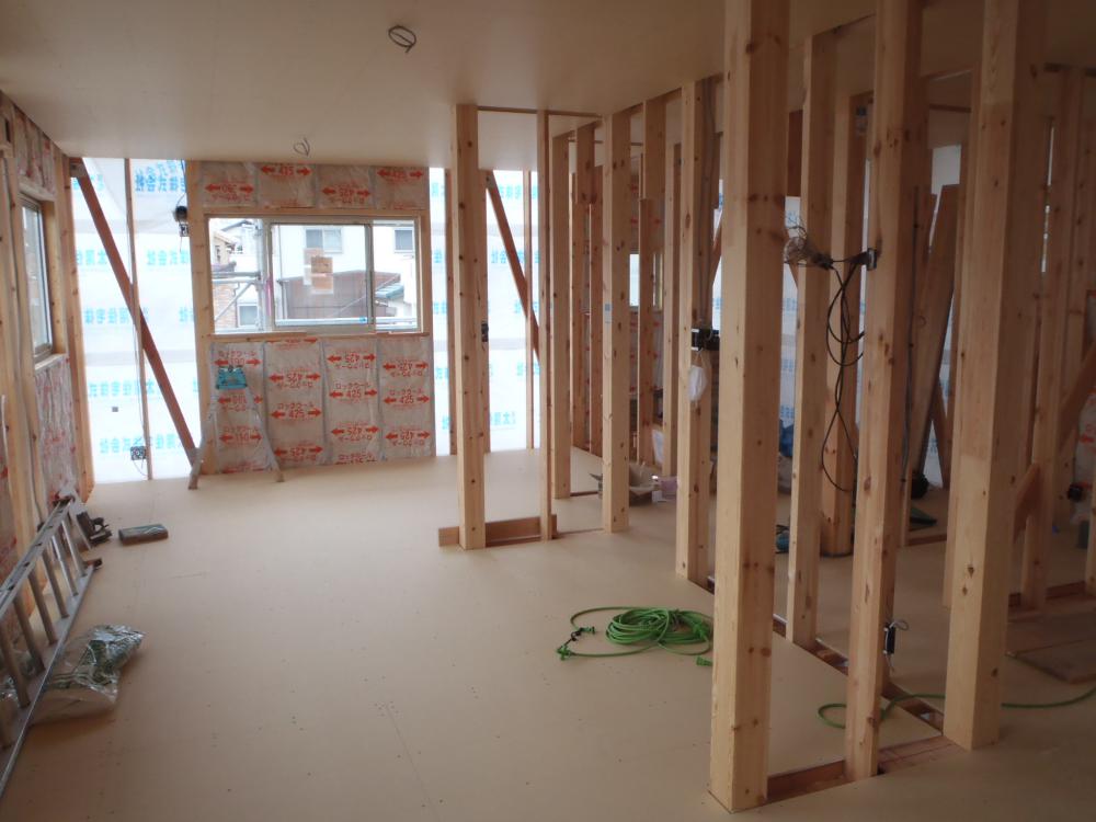 2階床下地ボード敷き、1階天井下地組み及びボード貼りを