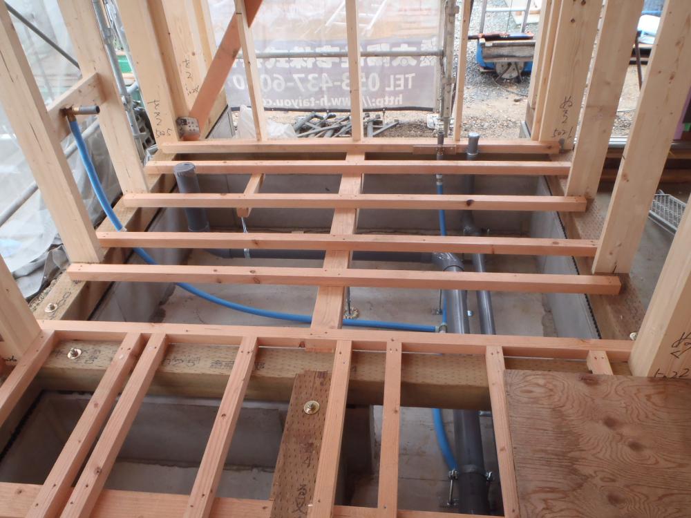 床下地材を本締めし、床断熱材入れ、下地合板貼りと