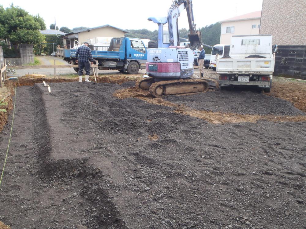 ・地鎮祭おめでとうございます。地盤調査の報告書より、 しっかりと地盤強度が確認出来き、基礎工事に着手しました。 ・丁張り(基礎の基準となる位置、高さ出し)を行い、掘削地業を 進めています。