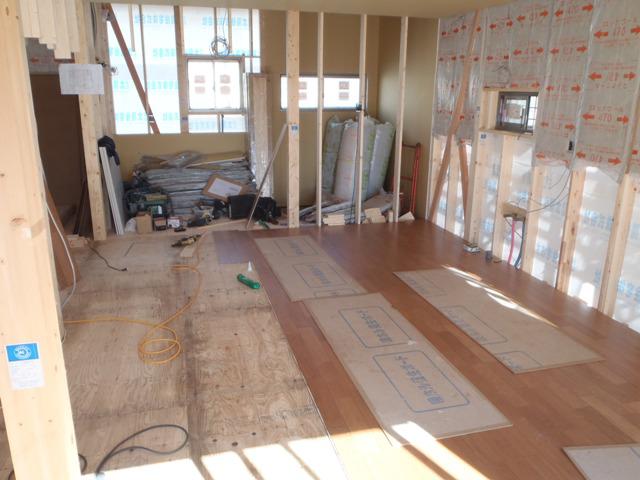 ・木工事、天井下地組み及びボード貼りを終え壁断熱材入れ 外壁下地材打ちを終え軒天板材貼り、床フローリング貼りと 進めています。 ・窓枠材・建具枠材が搬入され順次取付を進めていきます。